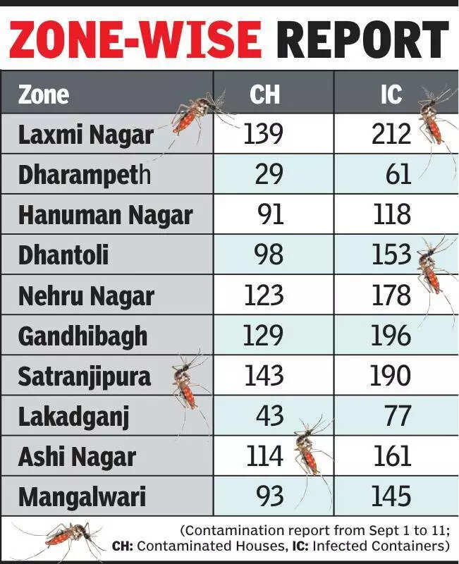 Nagpur: The fourth round of surveys by ASHA workers and breeding checkers revealed persistent mosquito breeding sites across Nagpur, even as the cumulative dengue tally for 2025 reached 60 cases and chikungunya 12. Since September 1 till date, the city has recorded 13 new dengue cases and two of chikungunya.According to data from NMC’s health department, of the 28,604 houses inspected from September 1 to 11, as many as 1,002 were found breeding mosquitoes. Out of 65,373 containers checked, 1,491 were detected with mosquito larvae.Satranjipura and Laxmi Nagar zones were the worst affected. Satranjipura recorded 143 contaminated houses and 190 infected containers, while Laxmi Nagar reported 139 houses and 212 containers breeding mosquitoes. Gandhibagh (129 houses, 196 containers), Ashi Nagar (114 houses, 161 containers), and Nehru Nagar (123 houses, 178 containers) also showed significant contamination. Mangalwari zone, which saw the widest coverage, reported 93 contaminated houses and 145 infected containers, while Hanuman Nagar (91 houses, 118 containers) and Dhantoli (98 houses, 153 containers) also reflected substantial breeding.Progressive figures since August 1 underscore the scale of surveillance: Over 17.2 lakh houses were inspected, with 80,194 found contaminated, while 34.8 lakh containers were checked, of which over 1.07 lakh were infected.NMC medical officer (health) Dr Deepak Selukar said intensified fogging, larvicidal treatment, and awareness drives are being undertaken across all 10 civic zones, particularly in hotspots like Satranjipura, Laxmi Nagar, Ashi Nagar, and Gandhibagh. He appealed to citizens to cooperate with field teams and ensure premises are free of stagnant water to help break the mosquito-breeding cycle during the post-monsoon season.BOXZone-wise contamination report (from Sept 1 to 11)Zone | Contaminated Houses | Infected ContainersLaxmi Nagar | 139 | 212Dharampeth | 29 | 61Hanuman Nagar | 91 | 118Dhantoli | 98 | 153Nehru Nagar | 123 | 178Gandhibagh | 129 | 196Satranjipura | 143 | 190Lakadganj | 43 | 77Ashi Nagar | 114 | 161Mangalwari | 93 | 145